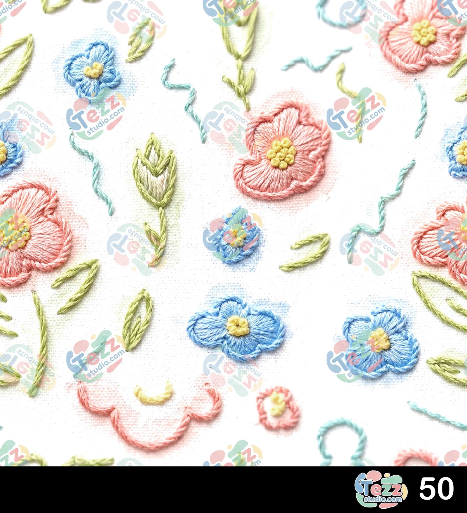 Elegant embroidery pattern with soft pink flowers and fine thread details on fabric.
