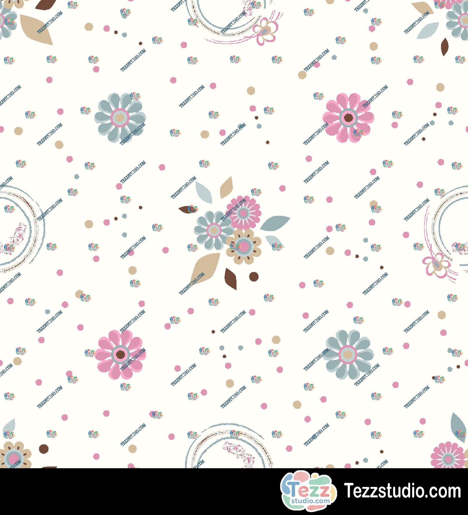 This elegant pastel allover repeat pattern features a harmonious mix of abstract florals, geometric motifs, and delicate dotted textures arranged evenly across a clean white background.